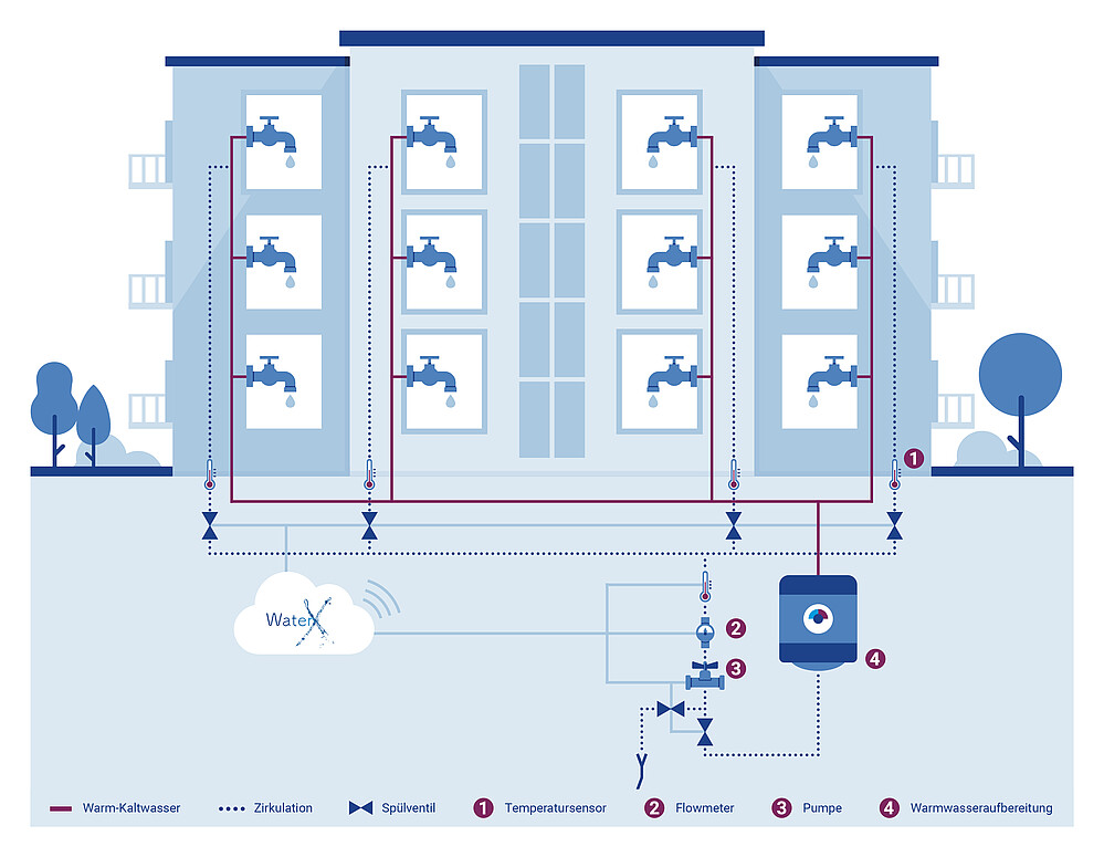 Über eine digitale Online-Anbindung werden Durchfluss und Wassertemperatur in allen Strängen Ihrer Anlage präzise erfasst. Existierende Gefahrenquellen für eine Legionellenkontamination lassen sich mit den gewonnenen Daten erkennen und punktgenau korrigieren. Dadurch können Sie die erkannte Problemquellen schon mit einer bedarfsgerechten Teilsanierungsmaßnahme dauerhaft beheben!
